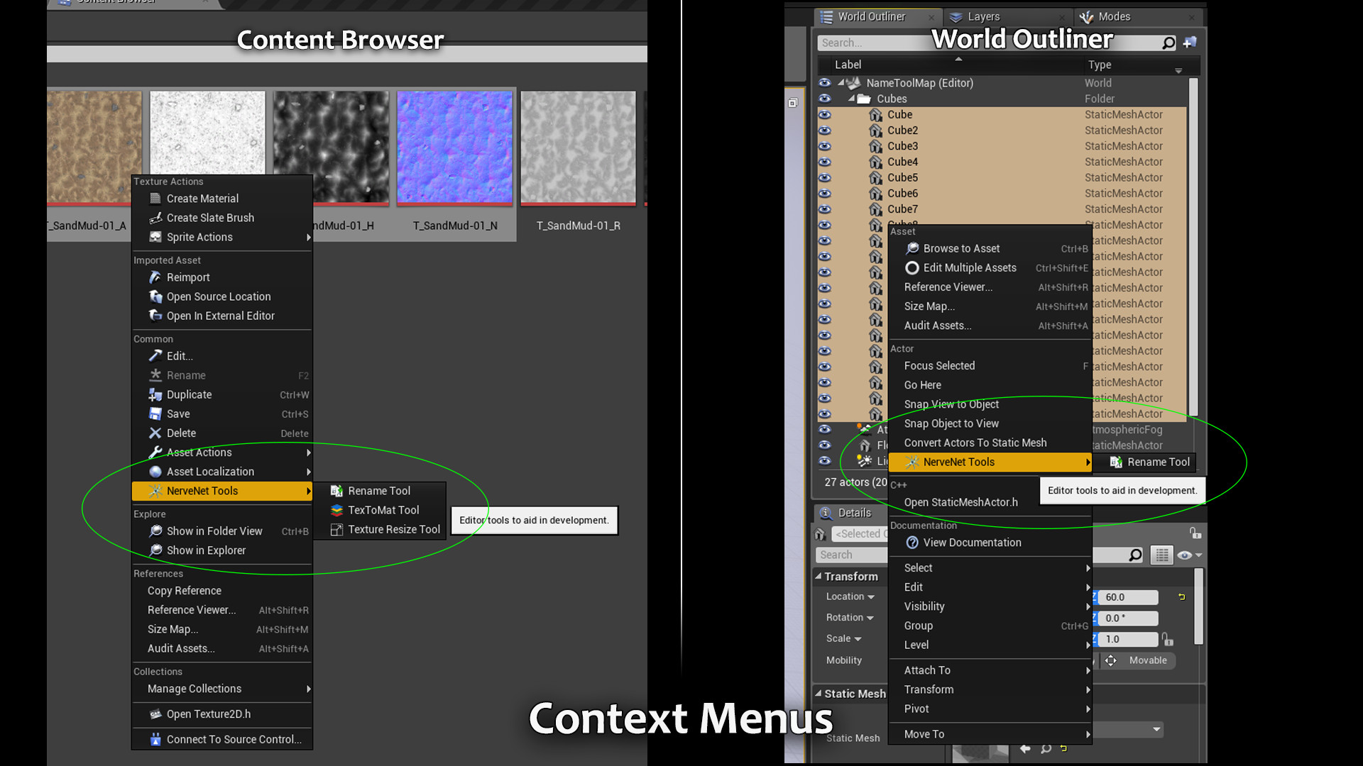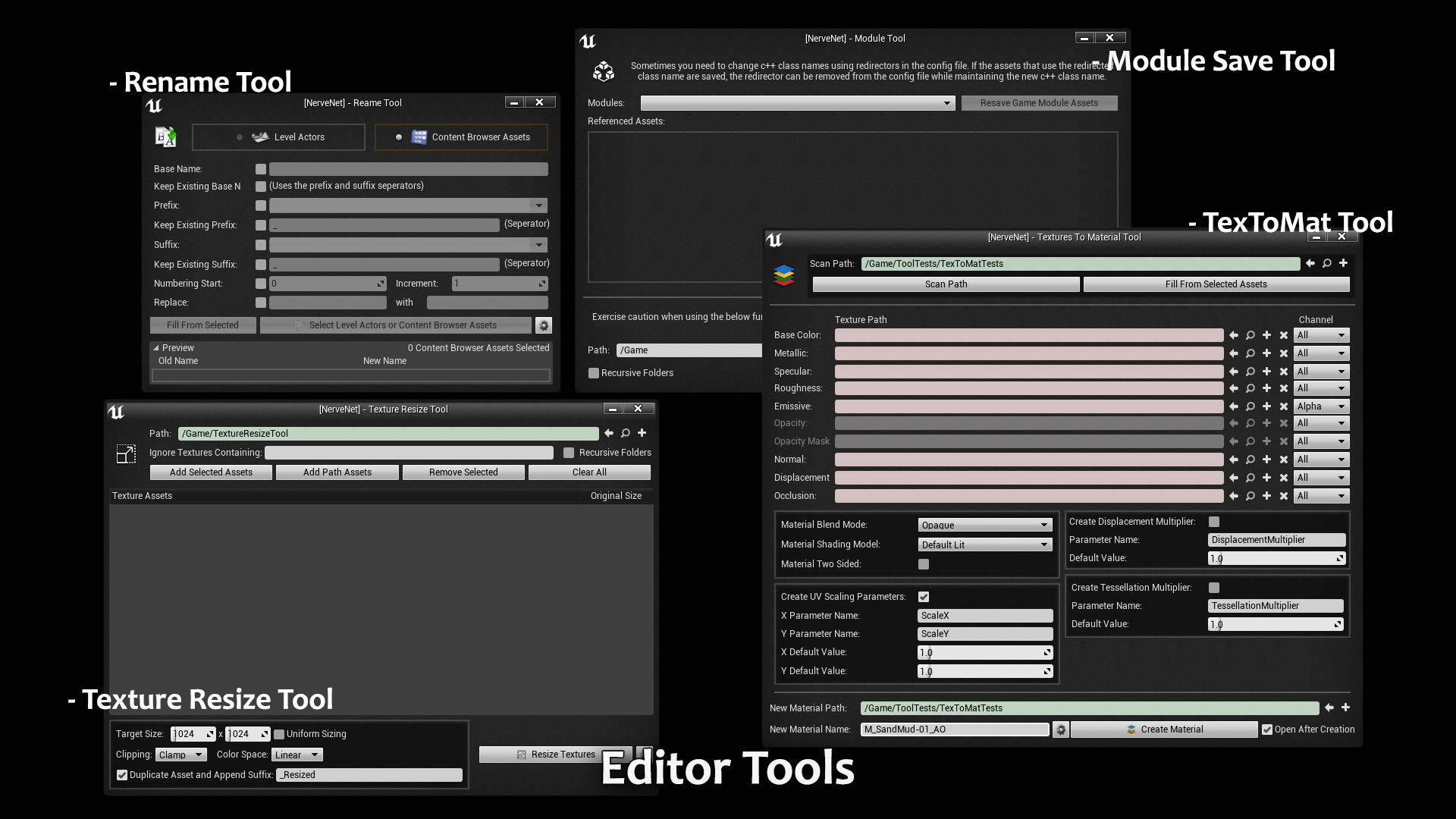 A collection of editor-only tools to aid in everyday project development. The collection includes five critical tools to help in everyday project development inside the editor itself. They include a Rename Tool for renaming content browser assets and level actors, a TexToMat Tool to quickly create a material from a set of textures with pre-defined parameters, and a Texture Resize Tool to resize textures in the editor without having to re-import. Included is also a fourth tool, the Module Save Tool, to help c++ developers with renaming classes.