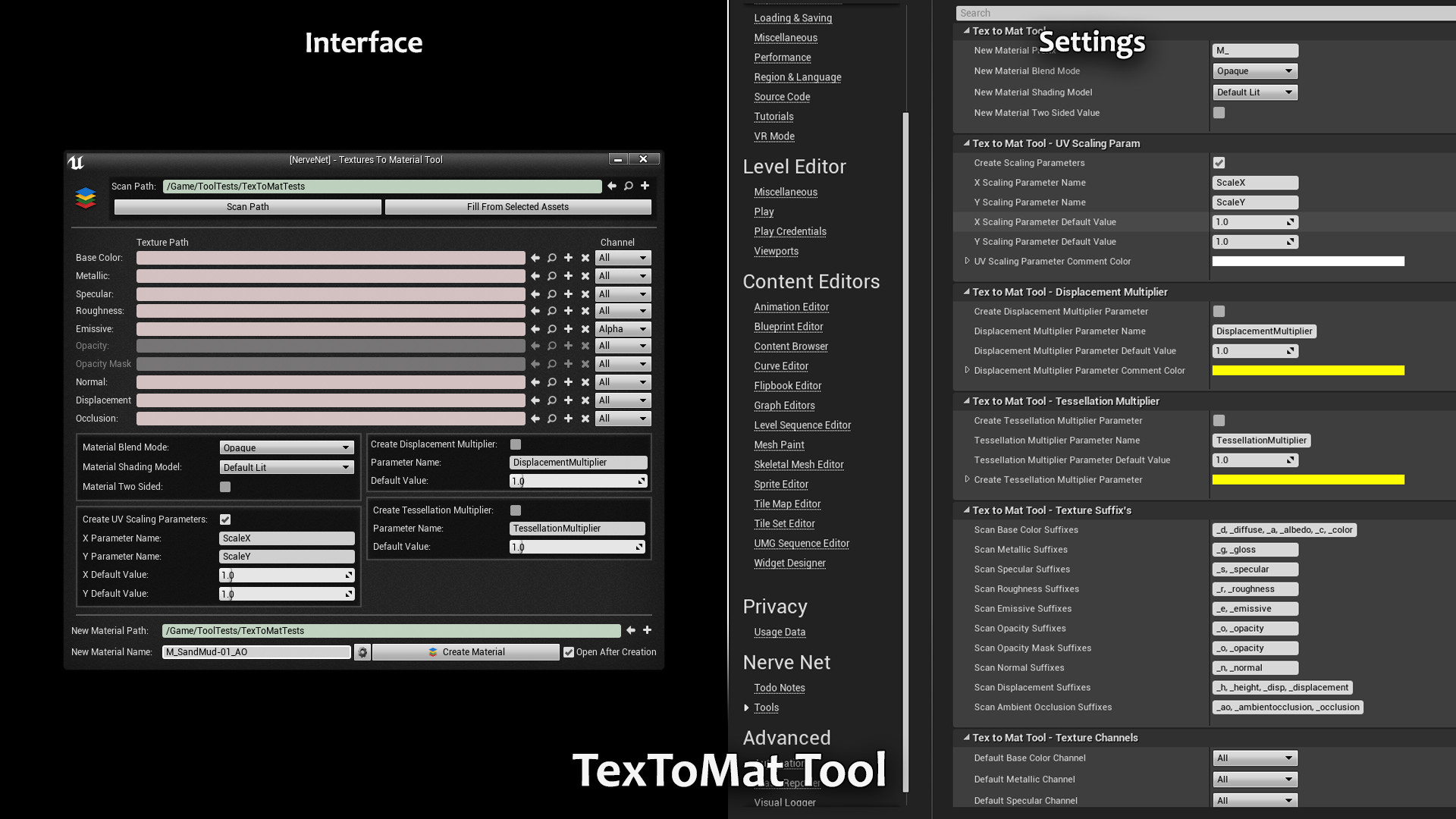 Scan an asset path or a set of selected texture files for appropriate suffix's and automatically create a material from the textures. Optionally creates UV scaling, tessellation, and displacement multiplier parameters. Saves a ton of time!