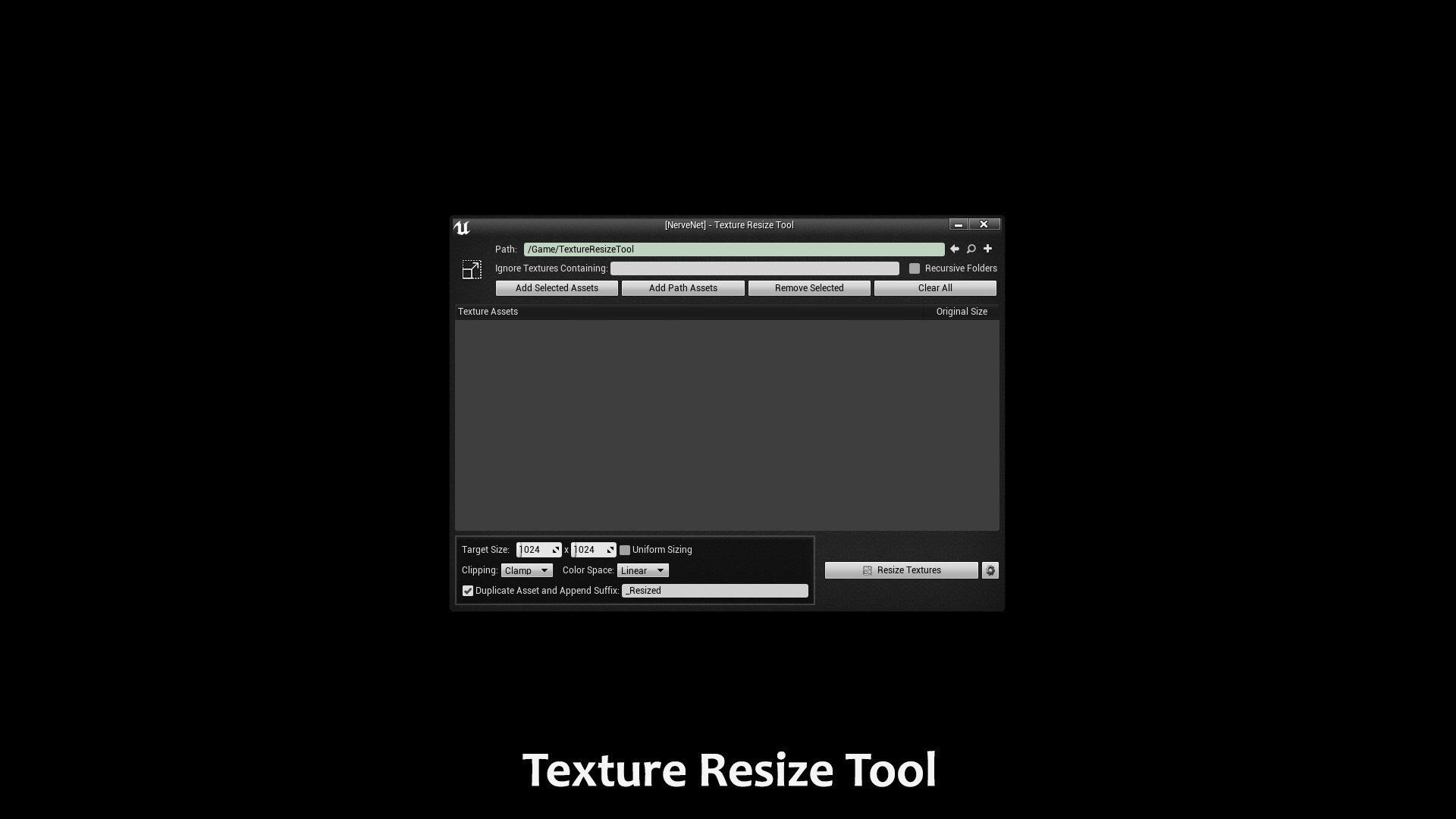A bulk texture asset resizing tool to quickly resize textures without having to leave the engine. Optionally creates a new texture with an added suffix instead of overwriting the original.